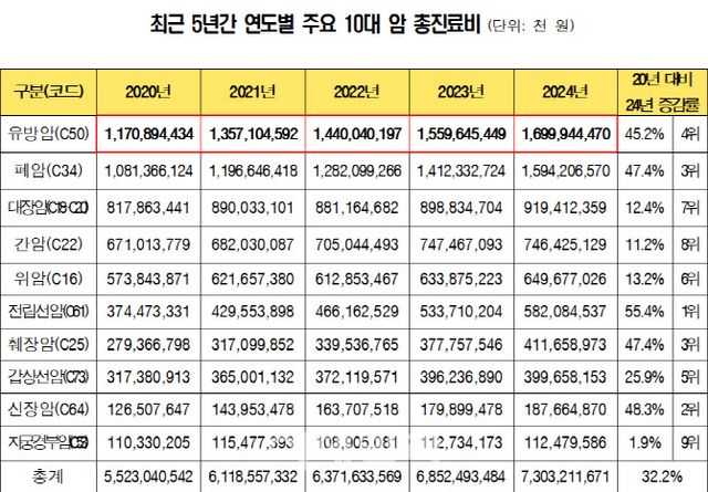 주요 10 대암의 총 진료비는 2020 년 5조 5230억원에서 2024년 7조 3032억원으로 32.2%(1조 7801억원 ) 늘어난 것으로 나타났다 .