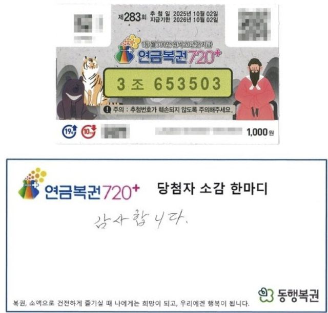 16일 복권수탁사업자 동행복권은 공식 홈페이지에 ‘연금복권 720+ 283회차’ 1등 당첨자 A씨의 사연을 전했다.