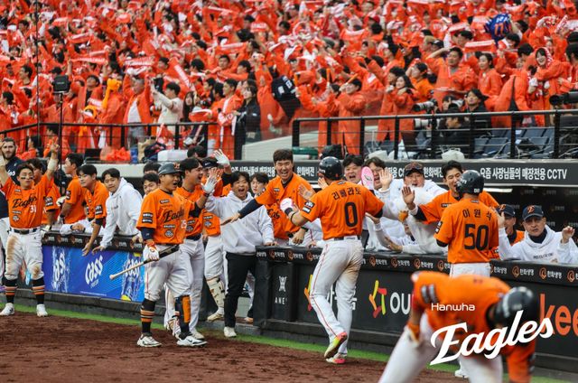 정식 경기 공백기를 비웃으며 포스트시즌 첫 경기부터 뜨거운 화력을 뿜어낸 한화 이글스. 사진=한화 이글스