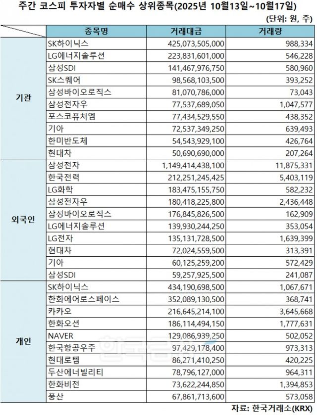 기관 'SK하이닉스'·외인 '삼성전자'·개인 'SK하이닉스' 1위 [주간 코스피 순매수- 2025년 10월13일~10월17일]