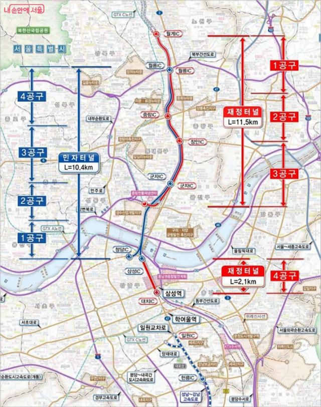 전체 1단계 구간은 성북구 석관동 월릉나들목(IC)에서 동대문구 군자나들목(IC), 강남구 청담·삼성나들목(IC)을 거쳐 3호선 학여울역 인근 대치나들목(IC)까지 이어지는 총 12.5㎞다. 중랑천과 한강 하부에 소형차 전용 왕복 4차로가 신설되며, 총 7곳의 나들목이 설치된다. 완공 목표는 2029년이다.