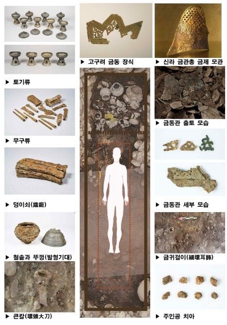 무덤에서는 총 165점의 유물이 나왔다. 특히 신라에서 가장 오래된 것으로 추정되는 금동관 일부가 확인돼 신라 지배층의 금속 공예 기술 연구 규명에 단서가 될 것으로 기대된다.