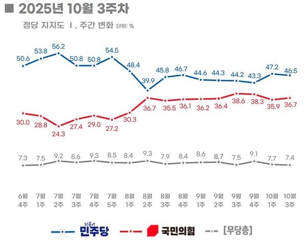 더불어민주당 정당 지지율이 소폭 하락하고 국민의힘은 오르면서 양당 격차가 한 자릿수까지 줄어들었다.