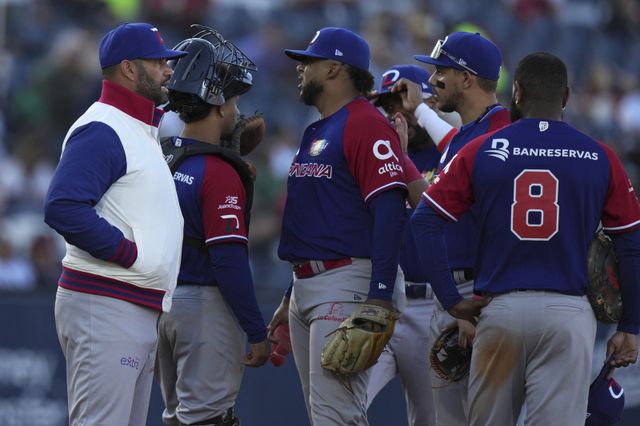Dominican Republic's manager Albert Pujols, left, speaks with his players during a Caribbean Series baseball semifinal game against Venezuela at Nido de los Aguilas stadium in Mexicali, Mexico, Wednesday, Feb. 5, 2025. (AP Photo/Fernando Llano)/2025-02-06 11:22:47/ <저작권자 ⓒ 1980-2025 ㈜연합뉴스. 무단 전재 재배포 금지, ai 학습 및 활용 금지>