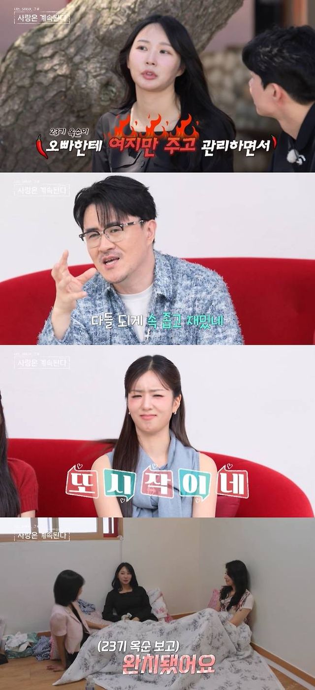 이어 "그분(23기 옥순)과 23순자는 '나솔사계' 출연 전부터 사이가 소원했다. 당시 23순자가 23영철과 사귀는 사이라고 알고 있던 그분은 23영철에게 직접 전화해 '언제 헤어졌냐, 진짜 헤어진 건 맞냐'며 사실 확인을 시도했고, 자기소개 시간 때부터 23순자가 이상형이 어떤 사람인지에 대해 얘기할 때마다 '그거 우리 기수 영철 오빠던데?', '그거 영철 오빠 같아서 좋다는 거 아니야?', '너 지금 생각나는 사람 있지'라며 다른 출연자들 앞에서 지속적으로 전남친을 언급해 23순자를 민망하게 했다"고 주장했다.