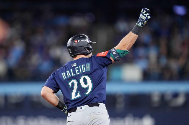 TORONTO, ONTARIO - OCTOBER 20: Cal Raleigh #29 of the Seattle Mariners is congratulated at the dugout after hitting a solo home run during the fifth inning against the Toronto Blue Jays in game seven of the American League Championship Series at the Rogers Centre on October 20, 2025 in Toronto, Ontario. Mark Blinch/Getty Images/AFP (Photo by MARK BLINCH / GETTY IMAGES NORTH AMERICA / Getty Images via AFP)/2025-10-21 10:57:07/ <저작권자 ⓒ 1980-2025 ㈜연합뉴스. 무단 전재 재배포 금지, ai 학습 및 활용 금지>