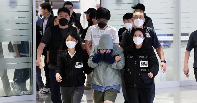 캄보디아 당국의 범죄단지 단속으로 적발돼 구금됐던 한국인들이 18일 수갑을 찬 채 인천국제공항 2터미널을 통해 송환되고 있다. / 뉴스1