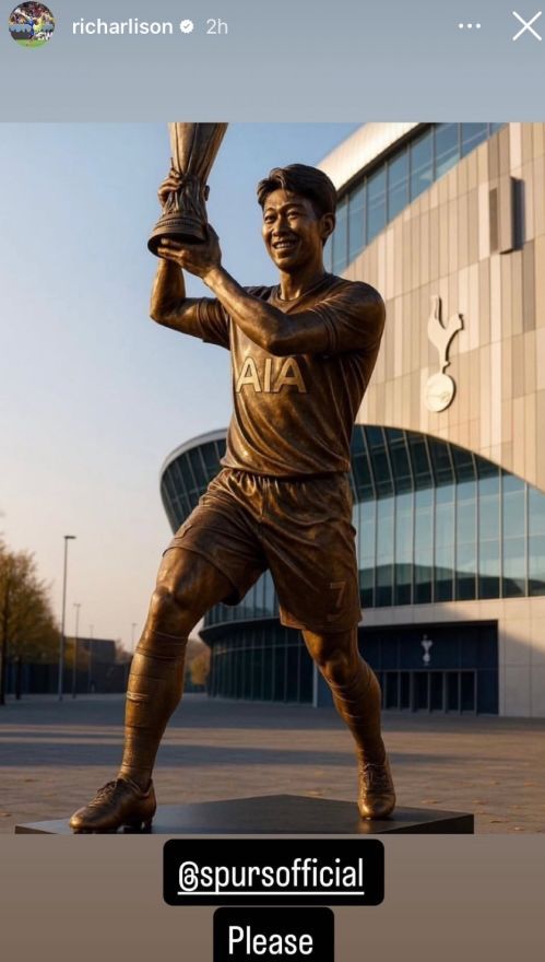 손흥민 동상 건립 논의는 지난 8월에도 한 차례 불거졌다. 당시 토트넘에서 손흥민과 3년을 함께했던 히샬리송은 자신의 SNS에 AI로 제작된 손흥민 동상 이미지를 게재하며 "스퍼스, 제발"이라는 글을 남겨 화제를 모은 바 있다.