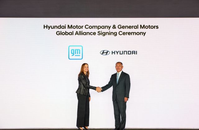 지난해 9월 정의선 현대차그룹 회장(오른쪽)이 메리 바라 GM 회장 겸 최고경영자(CEO)와 포괄적 협력을 위한 MOU를 체결한 후 악수하고 있다. 현대자동차그룹 제공.