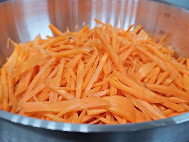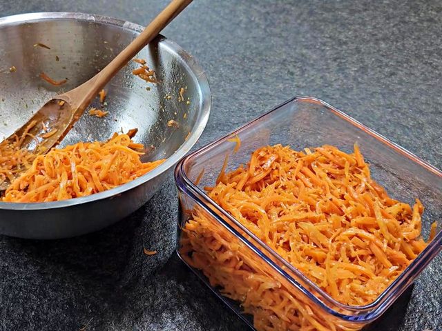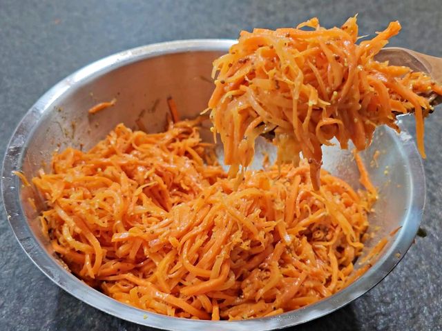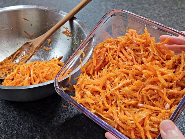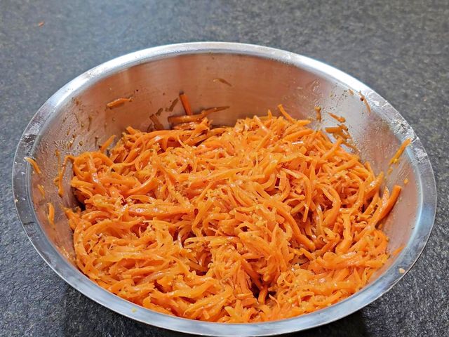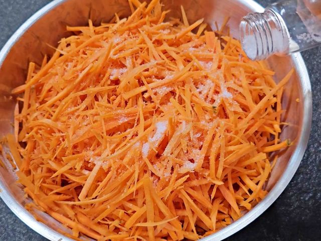 10분 정도 두면 당근의 수분이 빠져나오며 살짝 부드러워져요.