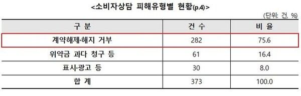 이 중 75.6%(282건)는 사업자가 계약해지를 거부한 사례였다.
