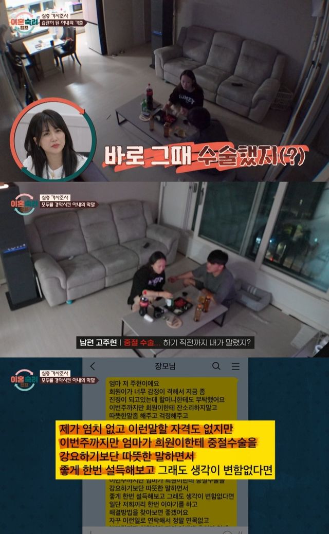 남편은 수술 이야기에 연신 눈물을 흘렸고, "설득하려고 노력을 많이 했다. 병원에 쪽지까지 써서 많이 힘든 거 같으니 심장 소리도 많이 들려달라고 했다. 장모님에게도 물어봤다"며 아내의 할머니에게까지 부탁했으나 아내를 막을 수 없었다고 전했다.