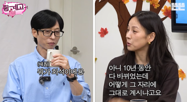 이날 이효리는 결혼 후 12년이 흐른 근황을 이야기하던 중 유재석에게 “10년 사이에 이렇게 많이 바뀌었는데 여기 그대로 있으니까 너무 놀랍다”며 “그대로 이 자리에 (있는데) 어떻게 된 거냐. 화석이에요?”라고 말했다.