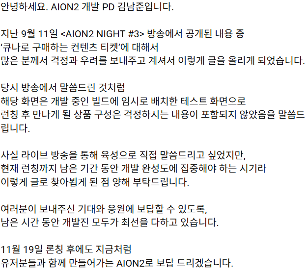 그래서 아이온2 커뮤가 불타자 공지가 올라옴