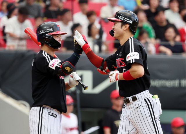 박해민 홈런 미소 (광주=연합뉴스) 조남수 기자 = 23일 광주기아챔피언스필드에서 열린 프로야구 LG 트윈스와 KIA 타이거즈의 경기. LG 박해민이 4회초에 선두타자로 나와 솔로홈런을 터뜨리고 홈인하며 문성주와 하이파이브 하고 있다. 2025.7.23 iso64@yna.co.kr/2025-07-23 19:19:48/ <저작권자 ⓒ 1980-2025 ㈜연합뉴스. 무단 전재 재배포 금지, ai 학습 및 활용 금지>