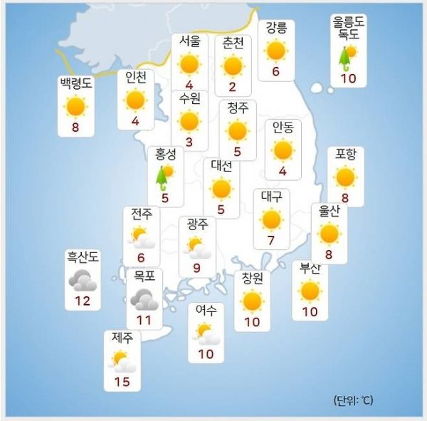 내일은 더 춥겠다. 오는 28일 아침 기온은 이날보다 1~5도가량 더 떨어져 전국 대부분 지역에서 5도 이하를 보이겠다. 중부내륙과 경북북부내륙은 영하권으로 떨어지겠다. 이런 추위는 수요일인 오는 29일까지 지속되겠다.