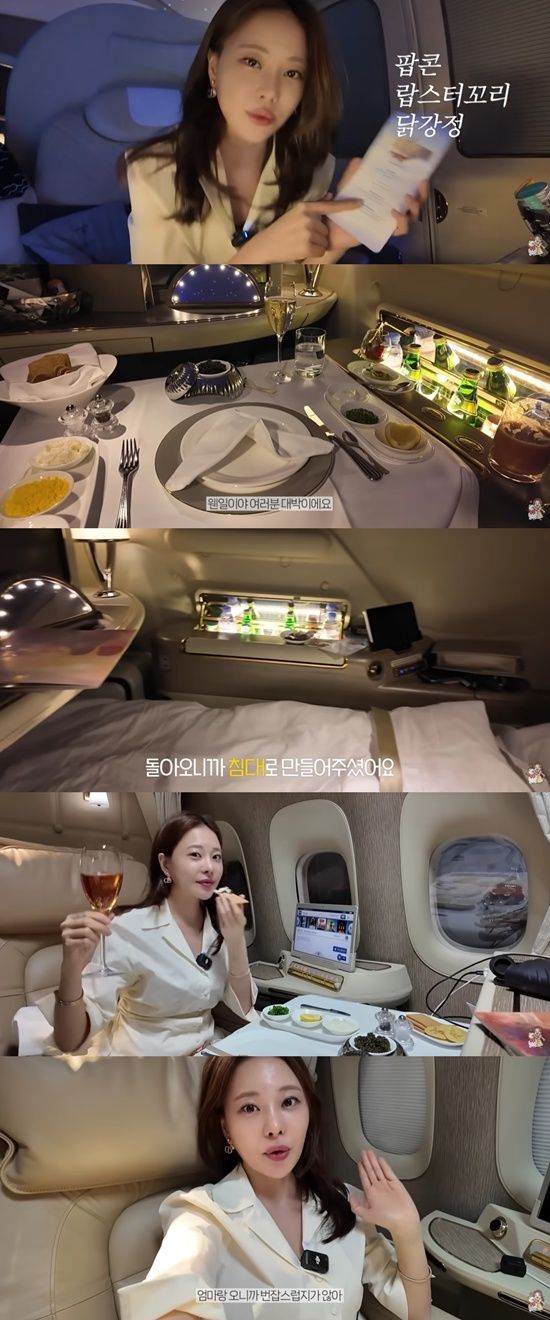 이어 명품 브랜드 불가리 파우치부터 고급스러운 재질의 슬리퍼와 안대 등 제품을 소개했다. 또한 아옳이는 샴페인에 캐비어를 먹으며 "캐비어를 고봉밥으로 줬다"고 감탄했다. 이 밖에도 레스토랑 못지 않은 디테일을 자랑하는 다양한 음식들이 눈길을 끌었다.