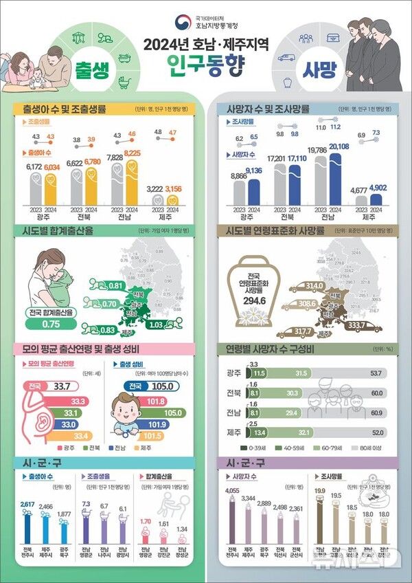 출생아 수는 전남 8225명, 광주 6034명이다. 전남은 전년 대비 5.1%증가한 반면, 광주는 2.2%감소했다.