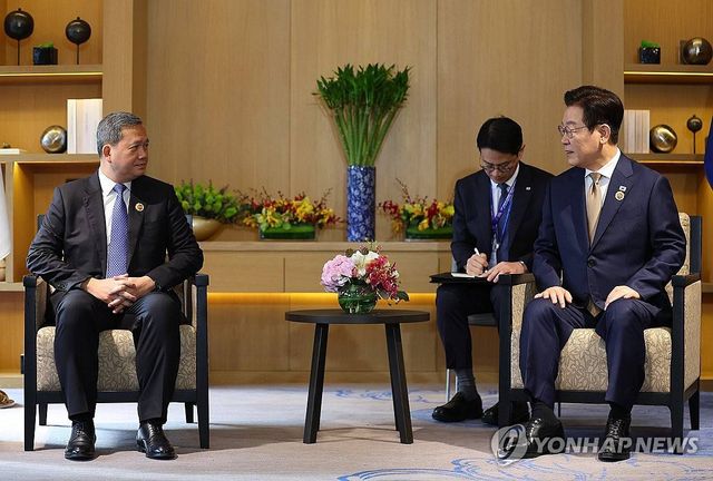 이재명 대통령과 훈 마네트 캄보디아 총리가 지난 27일 말레이시아 쿠알라룸푸르 한 호텔에서 정상회담을 하고 있다 / 연합뉴스