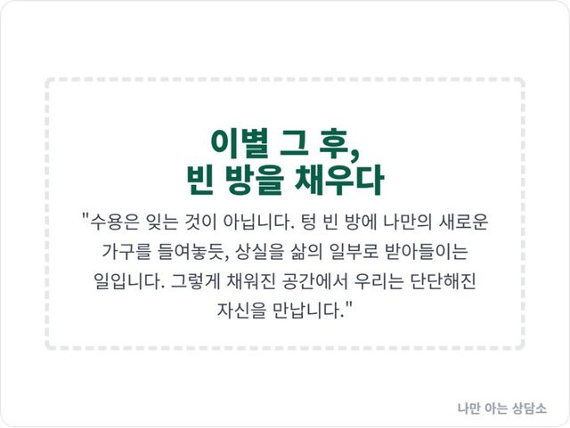 수용은 ‘잊는 것’이 아니다. 상처가 없었던 것처럼 행동하는 것은 더더욱 아니다. 수용은 그 사람이 내 삶에서 떠났다는 사실, 그리고 그가 남기고 간 이 텅 빈 공간을 내 삶의 일부로 받아들이는 것이다.