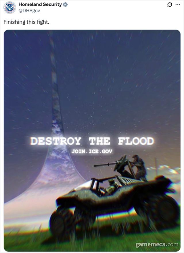 미국 정부의 행보는 여기서 그치지 않았다. 위 게시글이 올라온 지 몇 시간 뒤, 이번에는 국토안보부에서 ‘이 싸움을 끝내자(Finish this fight)’라는 문구를 담은 글을 게재했다. 함께 공개된 사진에는 헤일로에 등장하는 탈 것 ‘워트호그‘ 이미지 너머로 ‘불법체류자를 파괴하자(Destroy the Flood)’라고 적혀 있다. 하단에는 불법체류자를 잡아내는 이민세관단속국(ICE) 채용 페이지 링크도 발견할 수 있다.