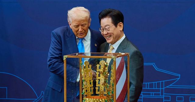 이재명 대통령이 지난 29일 경북 경주박물관에서 열린 한미 공식 환영식에서 도널드 트럼프 미국 대통령에게 무궁화 대훈장 수여와 천마총 금관 모형을 선물한 뒤 악수하고 있다. / 이재명 대통령 SNS.