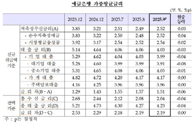 이에 따라 신규 취급 기준 예대금리차(대출 금리-수신금리)는 1.51%포인트로 8월보다 0.06%포인트 축소됐다. 지난 7월(1.55%포인트) 이후 석 달 만에 축소로 전환된 것이다. 잔액기준 예대금리차는 2.19%포인트로 전달과 같았다.