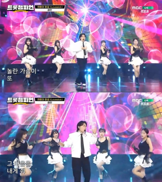 성민은 30일 방송된 MBC ON '트롯챔피언'에 출연해 '사랑이 따끔'으로 무대를 꾸몄다.