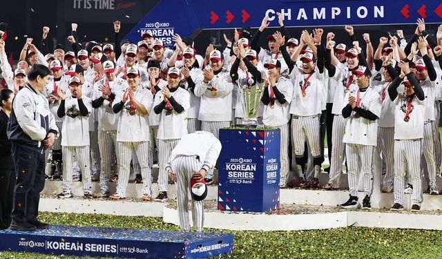 10월 31일 대전 한화생명볼파크에서 열린 프로야구 2025 신한 SOL뱅크 KBO 한국시리즈 5차전 LG 트윈스와 한화 이글스의 경기, 4대 1로 승리하며 통합 우승을 차지한 LG 염경엽 감독이 선수들에게 인사하고 있다. / 뉴스1
