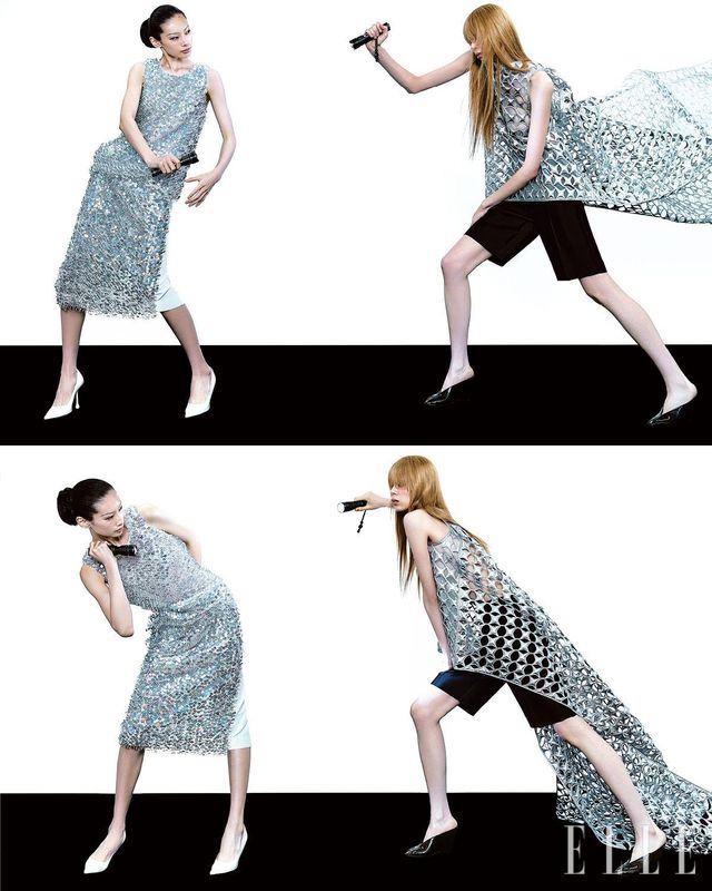 유엔신이 입은 플라워 모티프로 빼곡히 장식한 슬리브리스 드레스는 가격 미정, Jaden Cho. 스틸레토 힐은 가격 미정, Jimmy Choo. 아라가 입은 별 모티프의 플래그 톱과 블랙 쇼츠는 가격 미정, 모두 Jaden Cho. 스틸레토 힐은 가격 미정, Ferragamo.