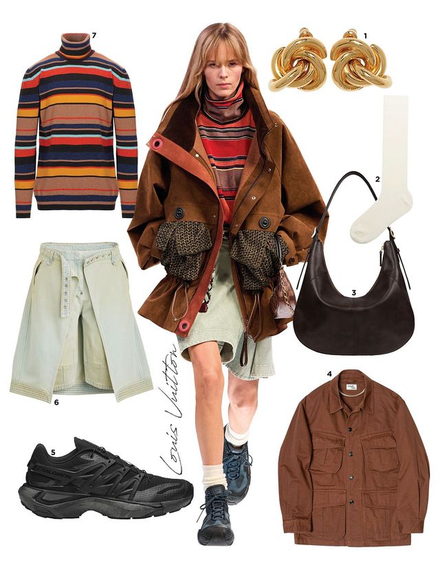 1 귀고리는 23만원대 Portrait Report. 2 양말은 1만원대 & Other Stories. 3 가방은 31만원대 Folnua. 4 유틸리티 재킷은 23만원대 Rough Side. 5 스니커즈는 34만원대 Salomon. 6 팬츠 스커트는 41만원대 Levi’s. 7 터틀넥 톱은 22만원대 Altea by Yoox.