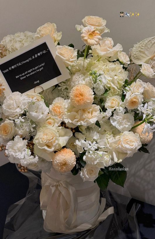 사진 속에는 풍성한 꽃다발과 함께 "2025 차 빼러 가요, 1Young/31 표 좀 빼주시Z...", "We're up all night to get Lucky! Show'em what u've got! (행운을 잡기 위해 밤새 달려보자! 네가 가진 걸 보여줘) -Xoxg"라는 멘트가 적힌 카드가 담겨 있었다.
