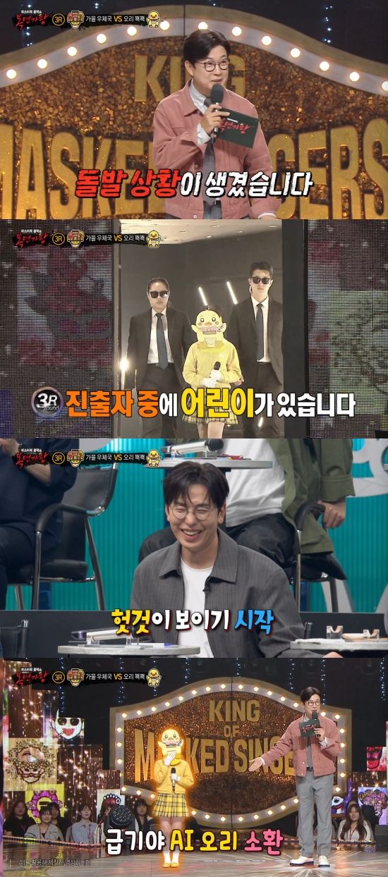 노래 이후 무대에 오른 MC 김성주는 "그런데 돌발 상황이 생겼다. 3라운드 진출자 중에 어린이가 있다. 굉장히 이례적인 일이 발생해서 (녹화 시간이 늦어지면서) '오리 꽥꽥'은 퇴근했다. 미성년자 보호 차원에서 부모님이 함께 동행하셔서 퇴근했다"고 알렸다.