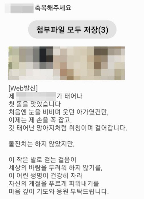 2일 연합뉴스에 따르면 광주시의회 A의원은 최근 단체 문자를 통해 “첫째 딸이 첫 돌을 맞았다. 돌잔치는 하지는 않지만 이 작은 발로 걷는 걸음이 세상의 바람을 두려워하지 않기를, 이 어린 생명이 건강히 자라 자신의 계절을 푸르게 피워내기를 마음 깊이 기도와 응원 부탁드린다”고 전했다.