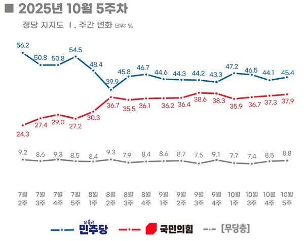 부동산 대책 악재에도 APEC 정상회의 성공적 개최와 경제 지표 호조가 민주당 지지층 결집으로 이어진 것으로 보인다. 국민의힘도 정부의 부동산 정책 비판과 최민희 과방위원장 사퇴 요구 등 대정부 대여 공세가 부각되면서 청년층의 결집을 이끌어내며 지지율이 소폭 상승했다.