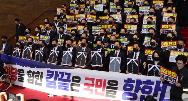 국민의힘 의원들이 내년도 시정연설을 위해 국회를 방문한 이재명 대통령을 향해 추경호 전 원내대표에 대한 내란특검팀의 영장청구를 규탄하는 피켓을 들고 침묵시위를 하고 있다. ⓒ 연합뉴스