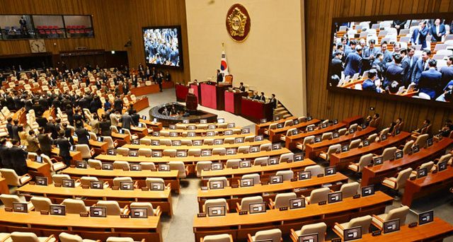 이 대통령이 국회에서 내년도 정부 예산안에 대한 시정연설을 하는 가운데 국민의힘 의원들은 불참한 채 본회의장 밖에서 침묵시위를 벌였다. ⓒ 연합뉴스