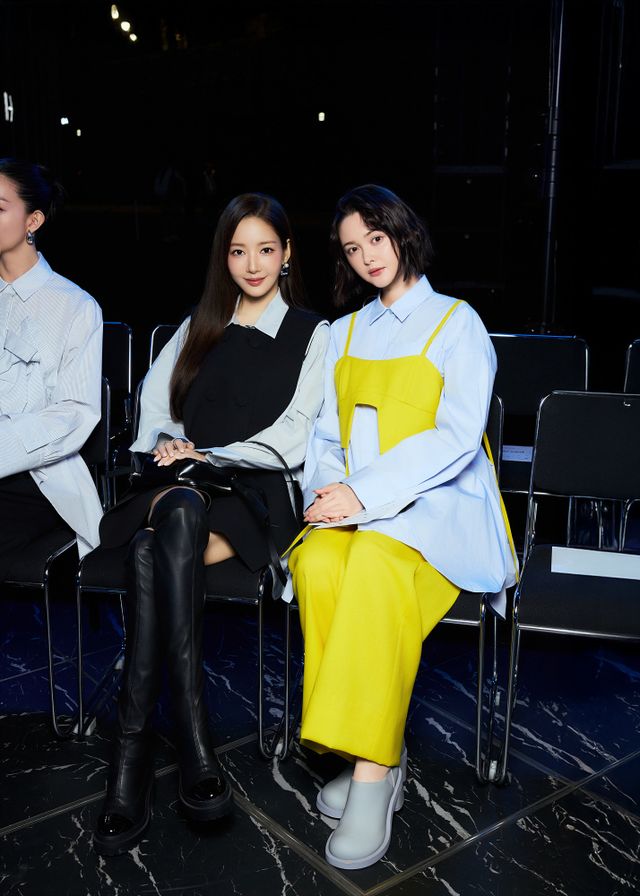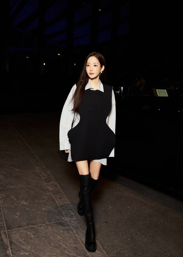 박민영은 간결하면서도 구조적인 블랙 베스트를 페일 그레이 셔츠와 매치한 미니드레스 룩으로 등장했다. 세련되고 우아한 실루엣 속에서 절제된 카리스마를 뽐내며, 엔폴드가 지향하는 모던 감성과 완벽한 조화를 이뤘다.