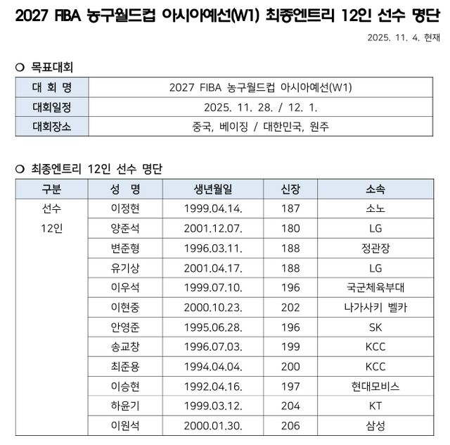 대한민국농구협회는 4일 오전 2027 국제농구연맹(FIBA) 월드컵 아시아예선 윈도우-1 대비 최종 12인 명단을 공개했다. 전희철 감독-조상현 코치 체제의 대표팀은 오는 28일과 12월 1일 중국과 2연전을 벌인다.