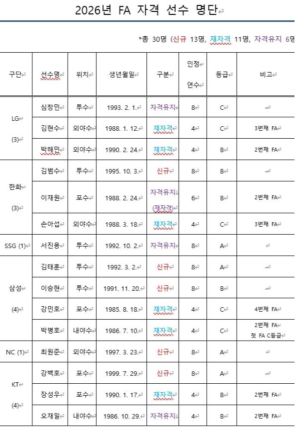 총 30명의 2026년 자유계약선수(FA) 자격 선수 명단이 공시됐다.