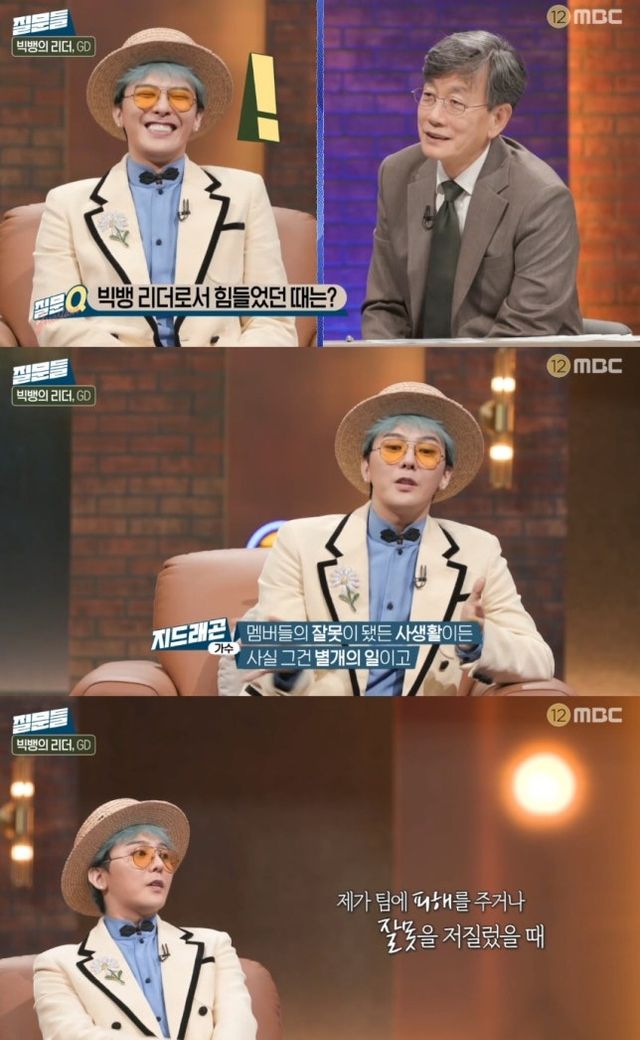 이어 손석희는 리더로서 힘든 순간을 물었다. 지드래곤은 "멤버들의 잘못이 됐든 사생활이든 사실 그건 별개의 일이고, 나한테 리더로서 가장 힘들었을 때는 내가 팀에 피해를 주거나 잘못을 저질렀을 때"라며 "자의건 타의건 그런 상황이 벌어지면 팀 전체가 흔들릴 수 있는 문제"라고 고백했다.