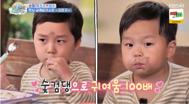 며칠 뒤 김준호와 은우 정우는 배나무와 밤나무가 있는 농장으로 향했다. 은우는 정석대로 배와 밤을 따며 일잘러 면모를 보였다. 밤송이를 두 발로 밟아 알밤만 쏙 빼내 자루를 채웠다. 정우는 “중 꺾 마”를 외치며 밤송이를 힘껏 차는 자신만의 방식으로 수확했다. 두 아이는 직접 주운 밤을 카메라 삼촌에게 선물했다.