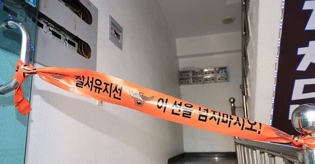 지난 4일 오전 서울 강동구 천호동 재개발조합 사무실에서 흉기 난동 사건이 발생했다. 사고 직후 소방 당국은 중상을 입은 50대 여성과 60대 여성, 70대 남성을 인근 병원으로 옮겼다. 사진은 현장의 경찰 차단선 / 연합뉴스