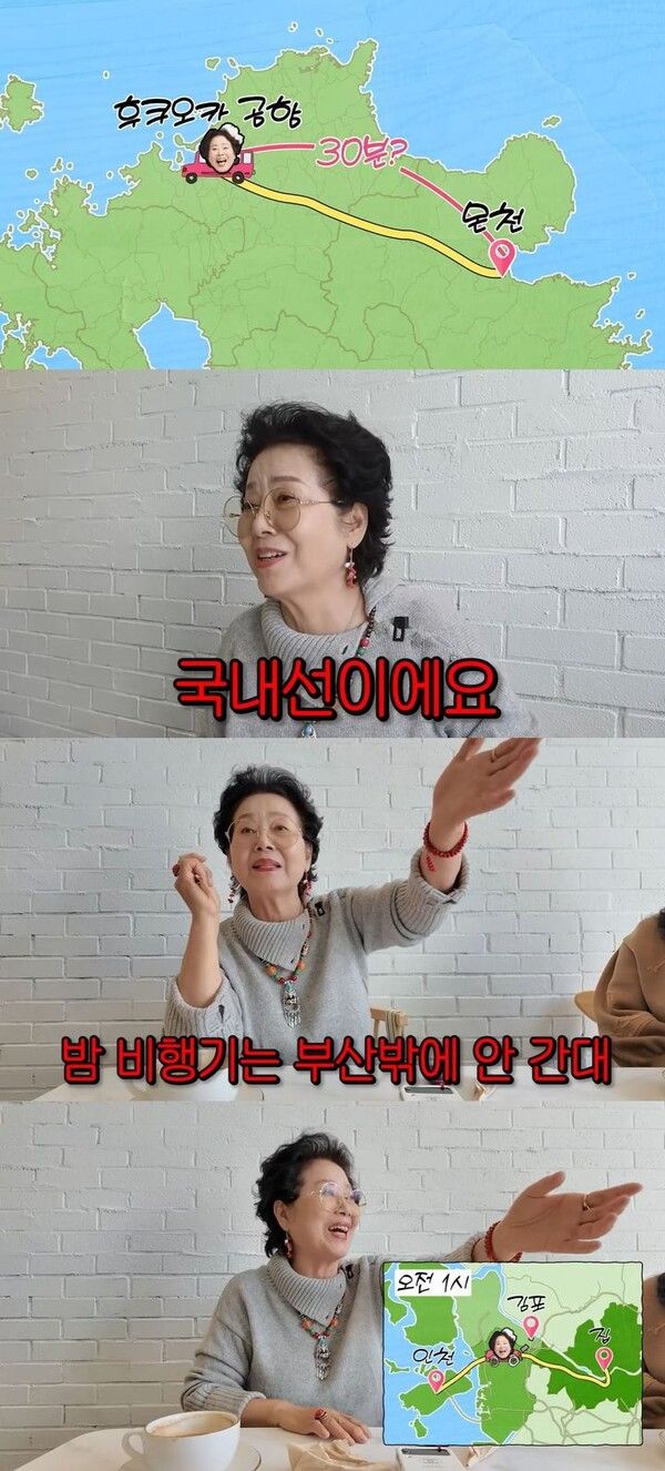 선우용여는 "예전에 언니랑 남편 셋이서 일본 여행갔었는데 좋은 온천이 후쿠오카 공항에서 2시간 걸려서 자고 와야 됐었다"고 했다.
