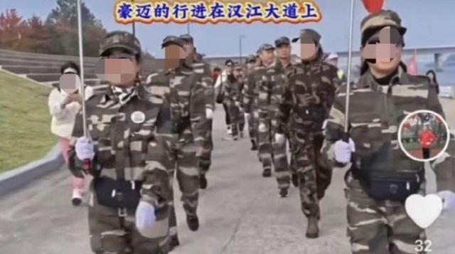 영상에는 중국어가 적힌 붉은 깃발을 든 사람을 앞세우고 군복 차림의 남녀가 제식훈련 하듯 행진하는 장면이 담겼다. 이들과 함께 트레이닝복을 맞춰 입은 사람들도 붉은 깃발을 들고 오와 열을 맞춰 행진했다.
