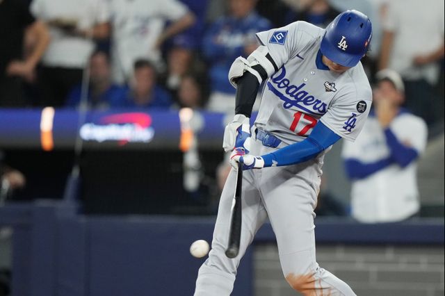 Los Angeles Dodgers' Shohei Ohtani hits a single against the Toronto Blue Jays during the fifth inning in Game 7 of baseball's World Series in Toronto on Saturday, Nov. 1, 2025. (Nathan Denette/The Canadian Press via AP) MANDATORY CREDIT/2025-11-02 10:56:43/ <저작권자 ⓒ 1980-2025 ㈜연합뉴스. 무단 전재 재배포 금지, ai 학습 및 활용 금지>