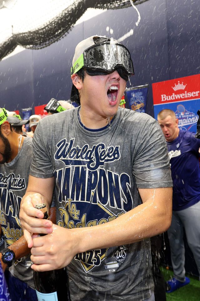 2025시즌 월드시리즈 우승을 차지한 뒤 뒤풀이를 즐기는 오타니 쇼헤이. [AFP=연합뉴스]
