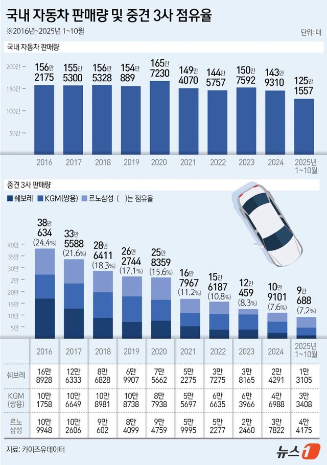 7일 카이즈유데이터에 따르면 올해(1~10월 기준) 국내 전체 승용차 판매는 125만 1557대(국산차 117만 6809대·수입차 26만 2501대)로 집계됐다. 이 가운데 르노코리아(4만 4175대), KGM(3만 3408대), 쉐보레(1만 3105대)를 합친 판매량은 9만 688대로 점유율은 7.25%에 불과했다.