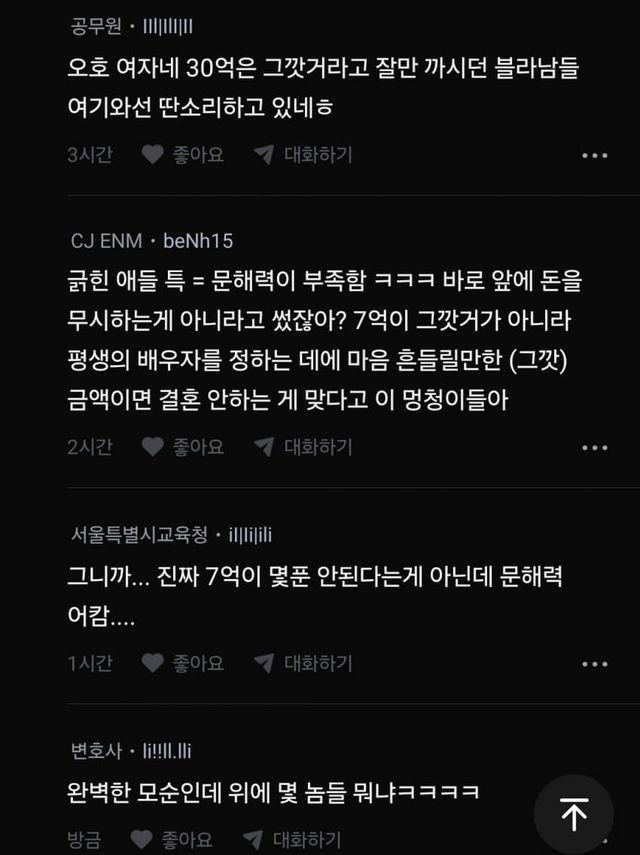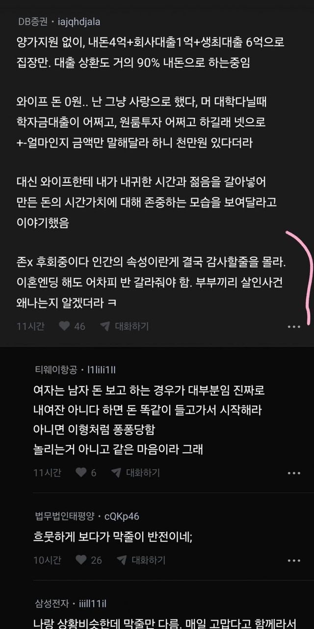 마지막으로 여자가 돈을 더가져오니 잘살고있다는 댓글들