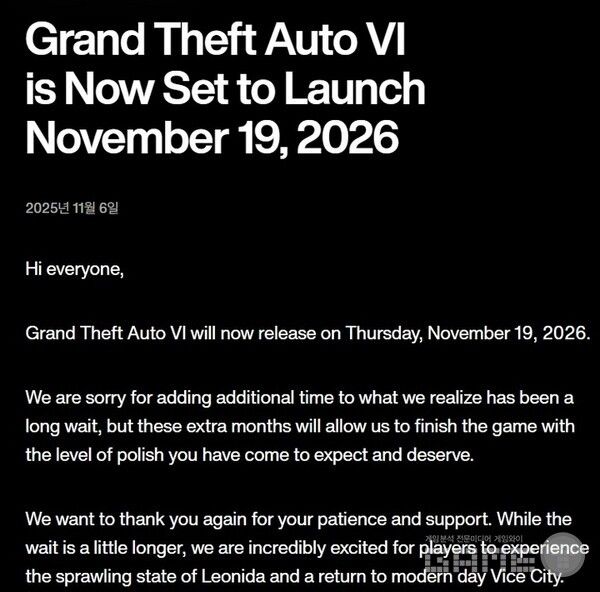 록스타게임즈는 공식 홈페이지를 통해 ‘GTA 6’ 출시 연기 사실을 알렸다. 록스타 게임즈는 이 몇 달의 추가 시간을 통해 기대하고 있을 완성도로 게임을 완성할 수 있을 것이라며 다시 한번 연기하게 된 것에 대해 사과의 말을 전했다.